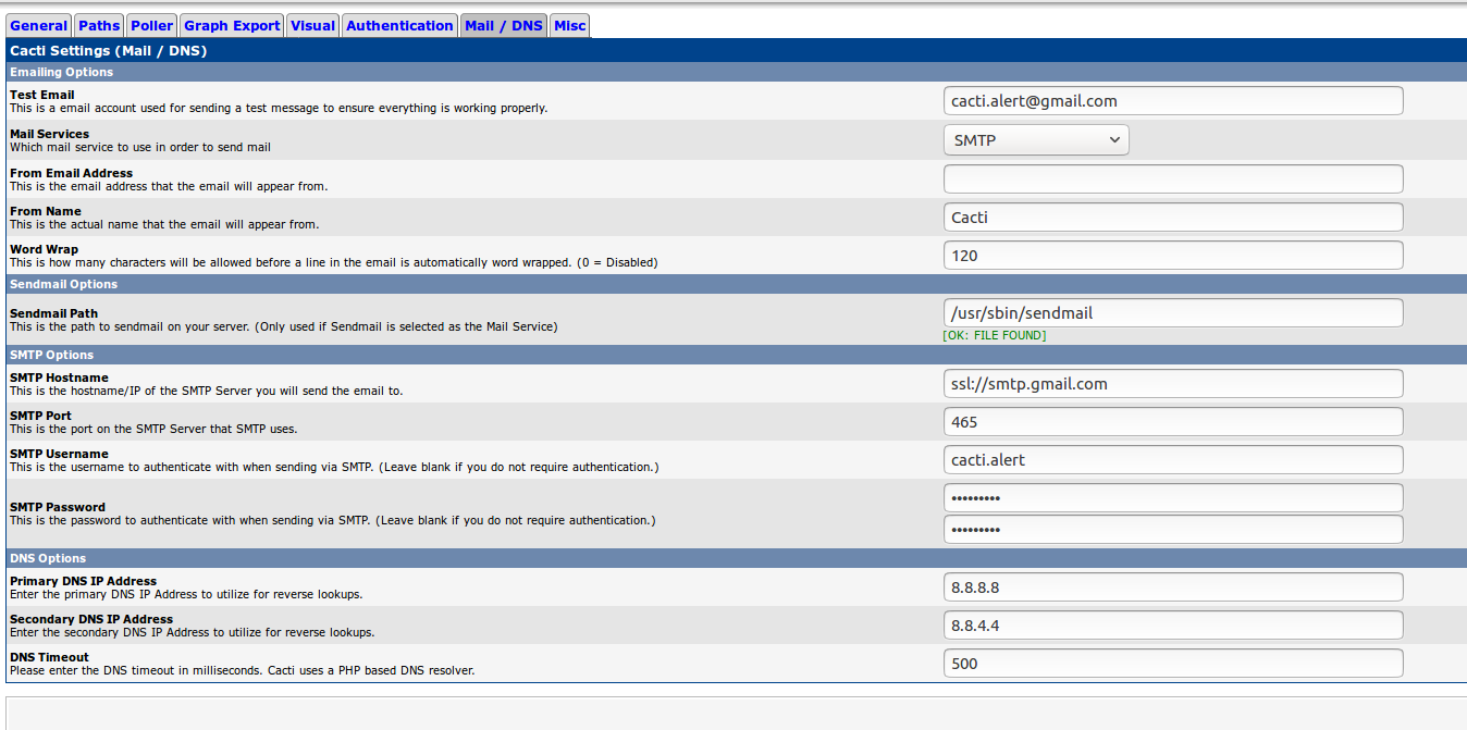 Agar cacti dapat mengirim email, saya perlu menambahkan sebuah plugin bernama setting dan melakukan konfigurasi otentikasi email di dalamnya.